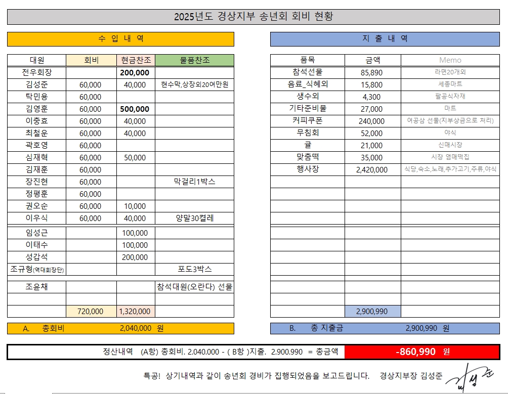 투명한 정산과정을 거치기 위하여 통장으로 찬조하신 금액을 표기하였습니다.