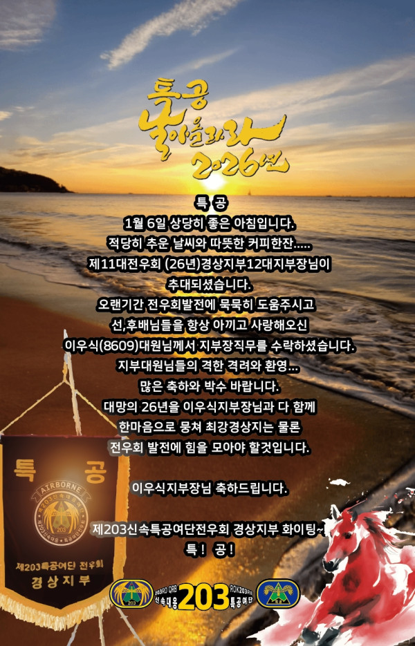 [경상지부 속보] 제11대전우회 경상지부12대지부장 추대 작성자 정보 홍보국장ㅣ김성준 작성 작성일 2026.01.06 09:08 컨텐츠 정보 151 조회 목록 본문 [ 국 방 속 보 ] 특공 2026년 대망의 새해가 밝았습니다. 제11대전우회 경상지부12대 지부장님이 추대 되었습니다. 이우식(8609) 010-5499-6962 경상지부의 쉼없는 전진~! 이우식 지부장님 축하드립니다. 특공 관련자료 다음 [정회원] 2026년 연회비 작성일 2026.01.05 12:58 댓글 0 등록된 댓글이 없습니다. 로그인한 회원만 댓글 등록이 가능합니다. 목록