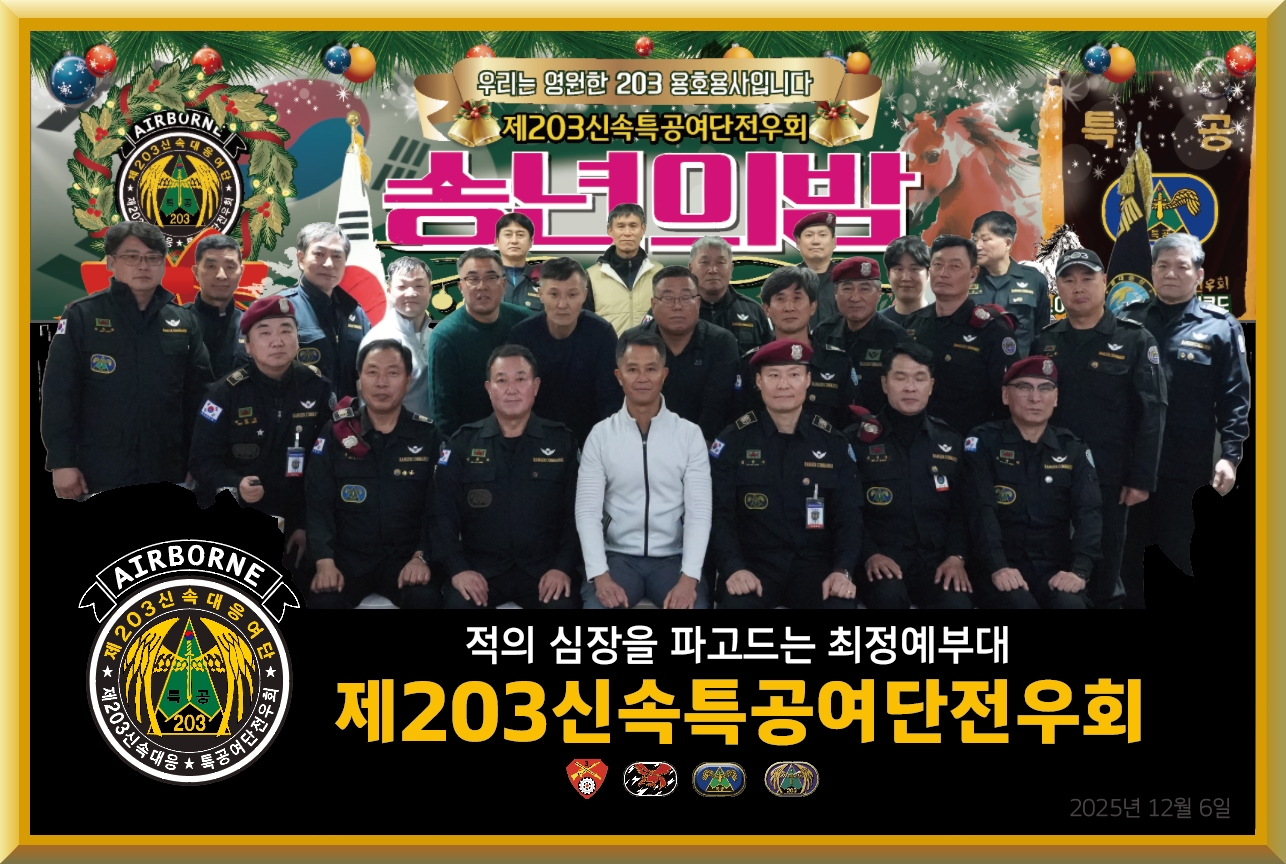 경상지부장ㅣ김성준님의 댓글 경상지부장ㅣ김성준 쪽지보내기 메일보내기 자기소개 아이디로 검색 전체게시물 쪽지보내기 메일보내기 자기소개 아이디로 검색 전체게시물 작성일 12.11 18:08 제203신속특공여단 전우회 2025년도 정기총회및 송년회 우리는 영원한 203용호용사이고 영원히 하나입니다. [https://www.rok203rb.com/data/editor/2512/cmt_1982694938_lFgUAQJt_d07fef3ee0697d11921680ddbee4f92b80a737aa.jpg] 제203신속특공여단 전우회 2025년도 정기총회및 송년회 우리는 영원한 203용호용사이고 영원히 하나입니다.