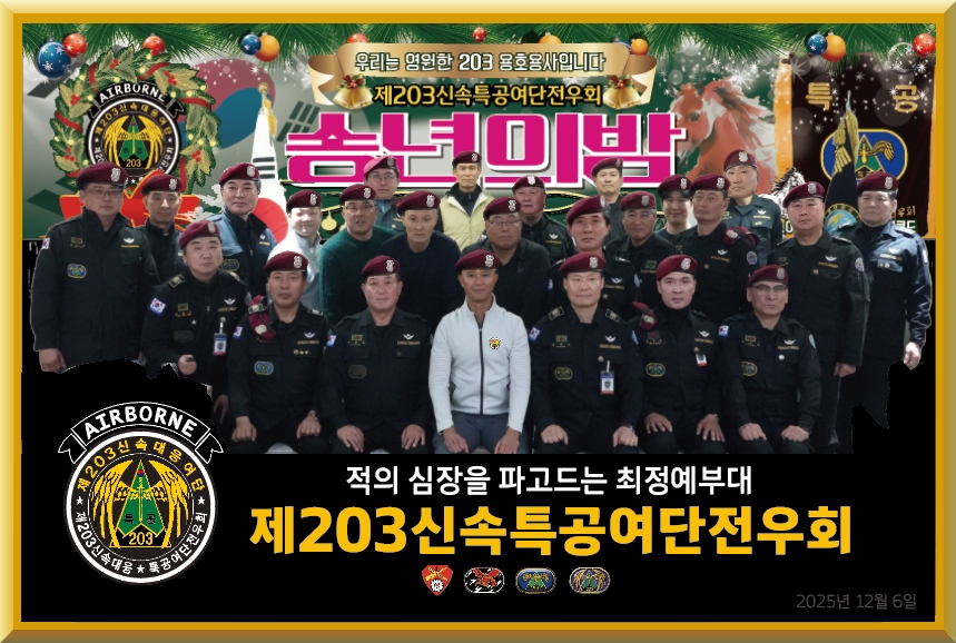 경상지부장ㅣ김성준님의 댓글 경상지부장ㅣ김성준 쪽지보내기 메일보내기 자기소개 아이디로 검색 전체게시물 쪽지보내기 메일보내기 자기소개 아이디로 검색 전체게시물 작성일 2025.12.11 18:08 제203신속특공여단 전우회 2025년도 정기총회및 송년회 우리는 영원한 203용호용사이고 영원히 하나입니다. 제203신속특공여단 전우회 2025년도 정기총회및 송년회 우리는 영원한 203용호용사이고 영원히 하나입니다.[https://www.rok203rb.com/data/editor/2512/cmt_2949223340_dzmZOsSh_af177fd4e93639734ae1556c80355dd473e19494.jpg]