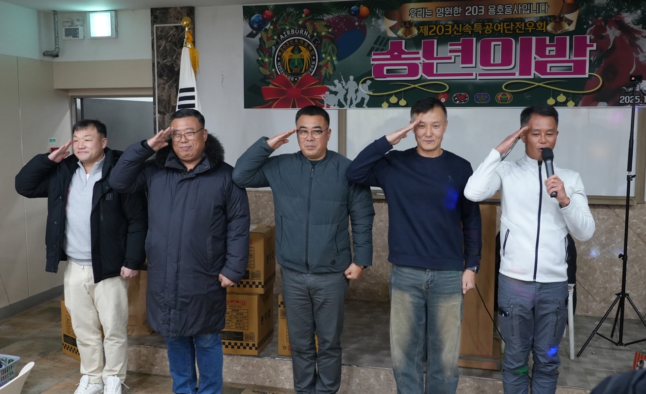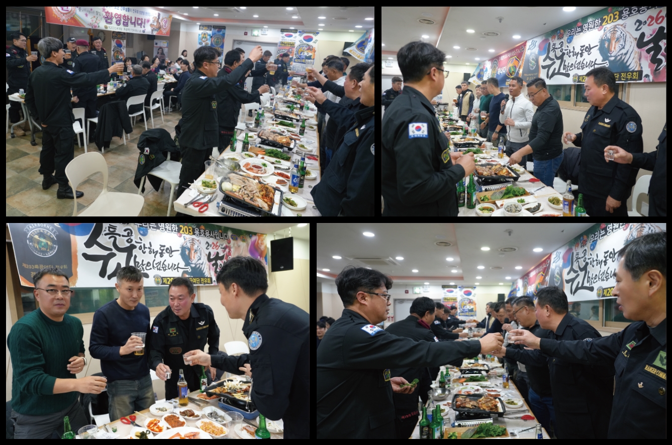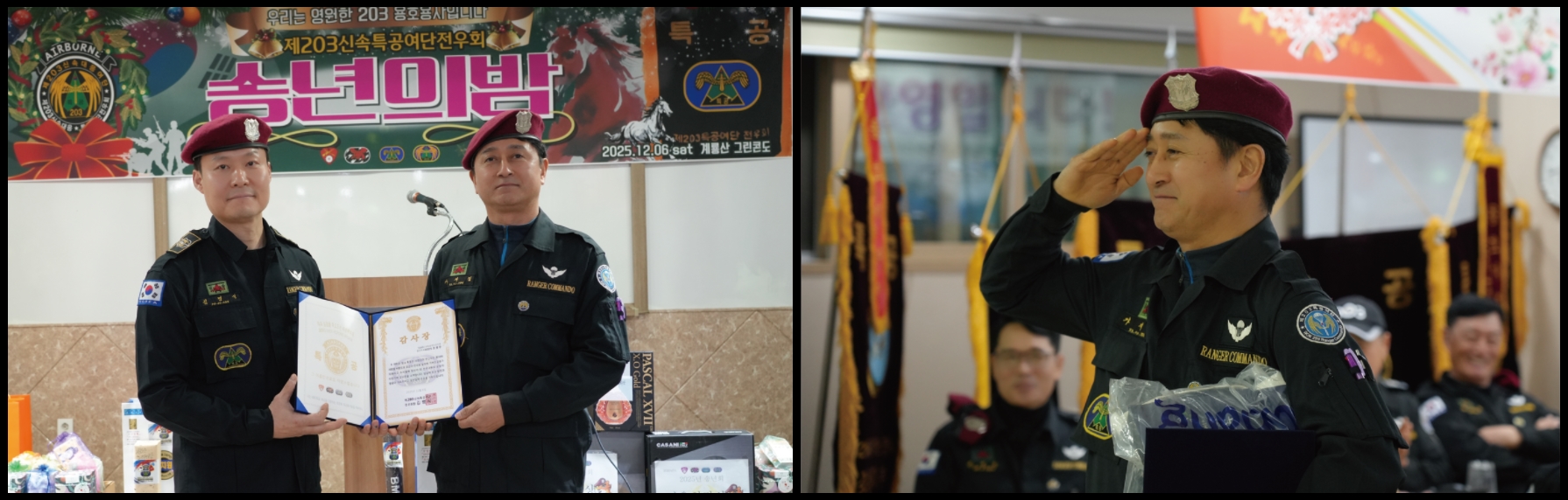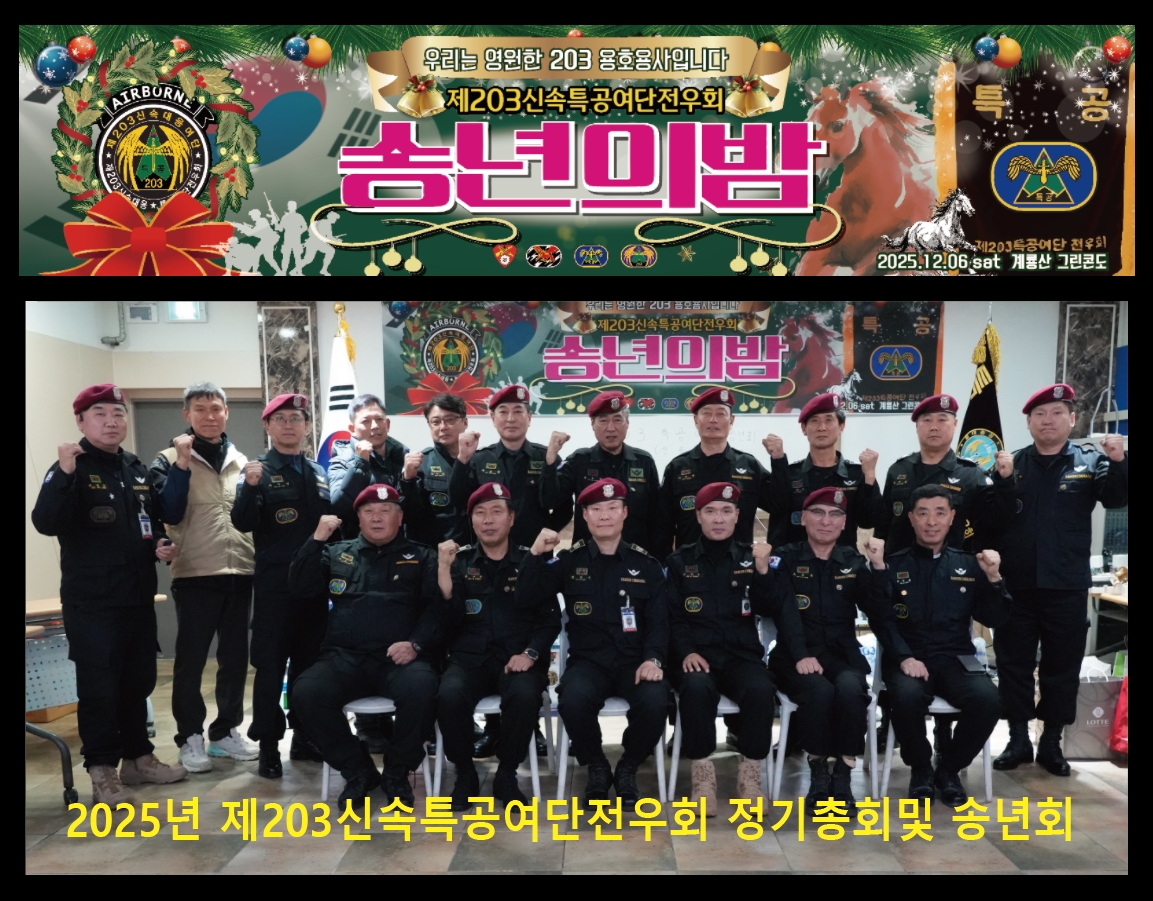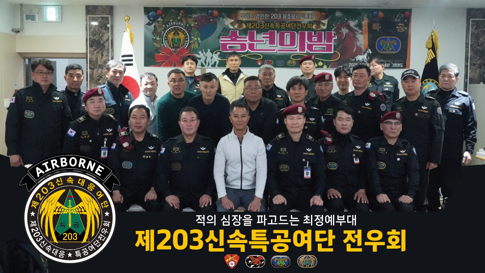 경상지부장ㅣ김성준님의 댓글 경상지부장ㅣ김성준 쪽지보내기 메일보내기 자기소개 아이디로 검색 전체게시물 쪽지보내기 메일보내기 자기소개 아이디로 검색 전체게시물 작성일 12.10 09:48 2025년도 제203신속특공여단 전우회 송년회에 자리를 빛내주신 모군 관계자분들(직책및 성함은 군사기밀로 인하여 표기x) [https://www.rok203rb.com/data/editor/2512/cmt_1982694938_1EOwZfGc_e9bbebb681aa162fbf2d4655e4255374cf6e21e8.jpg] 2025년도 제203신속특공여단 전우회 송년회에 자리를 빛내주신 모군 관계자분들(직책및 성함은 군사기밀로 인하여 표기x)
