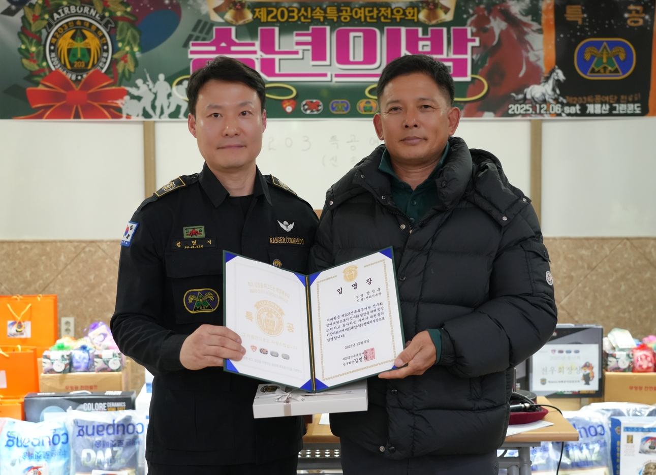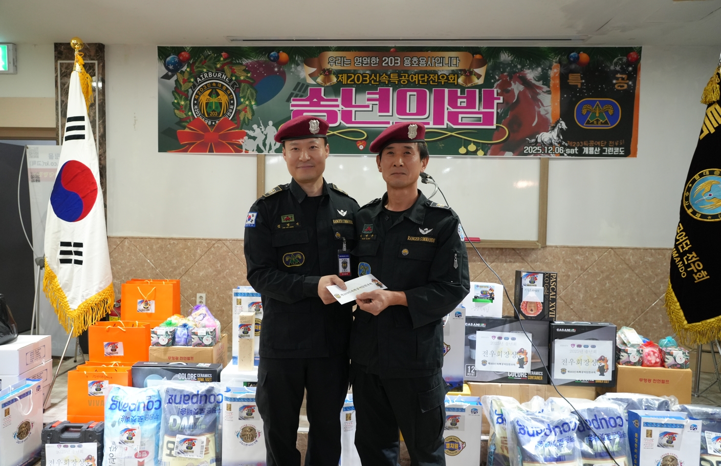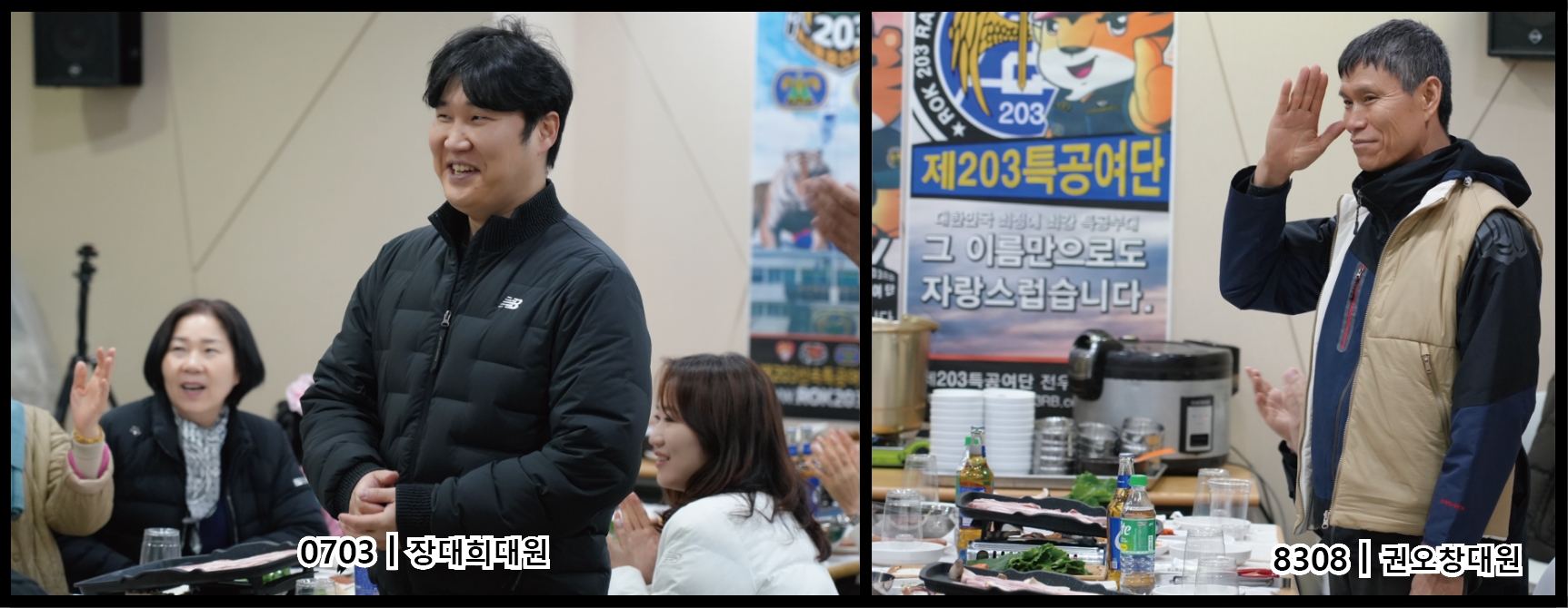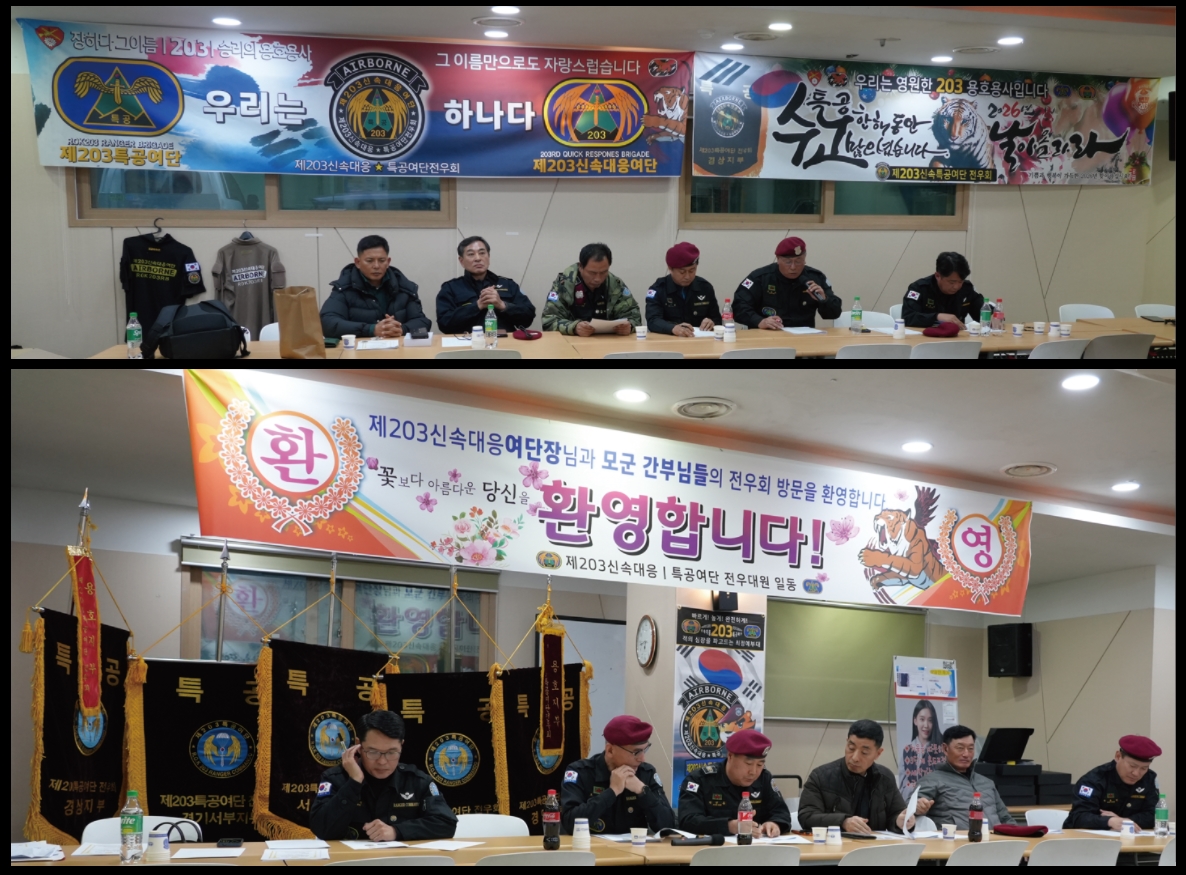 경상지부장ㅣ김성준님의 댓글 경상지부장ㅣ김성준 쪽지보내기 메일보내기 자기소개 아이디로 검색 전체게시물 쪽지보내기 메일보내기 자기소개 아이디로 검색 전체게시물 작성일 12.10 09:48 2025년도 제203신속특공여단 전우회 송년회에 자리를 빛내주신 모군 관계자분들(직책및 성함은 군사기밀로 인하여 표기x) [https://www.rok203rb.com/data/editor/2512/cmt_1982694938_1EOwZfGc_e9bbebb681aa162fbf2d4655e4255374cf6e21e8.jpg] 2025년도 제203신속특공여단 전우회 송년회에 자리를 빛내주신 모군 관계자분들(직책및 성함은 군사기밀로 인하여 표기x)